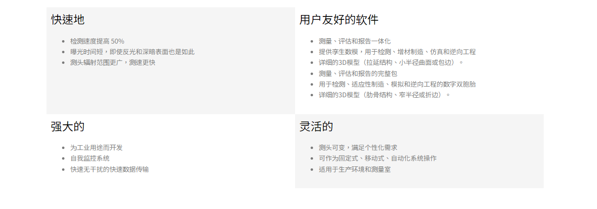 通过优良的硬体和软体组合,将三维扫描计量技术安全有效地整合到生产现场。其工业化产品设计,提供合适的防尘和防溅水保护。整个三维扫描仪系统通过光纤和智慧感测器通信,使资料传输快速、抗干扰,成为完全自行监控的系统。