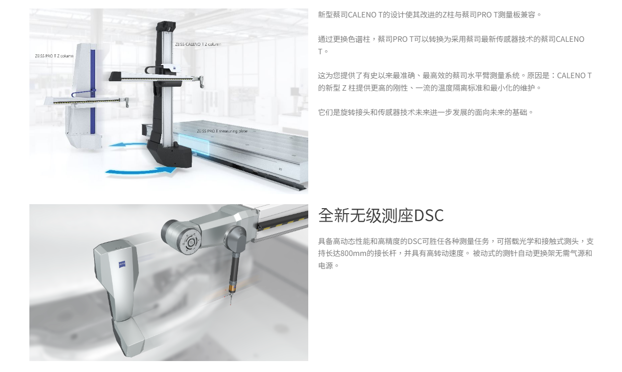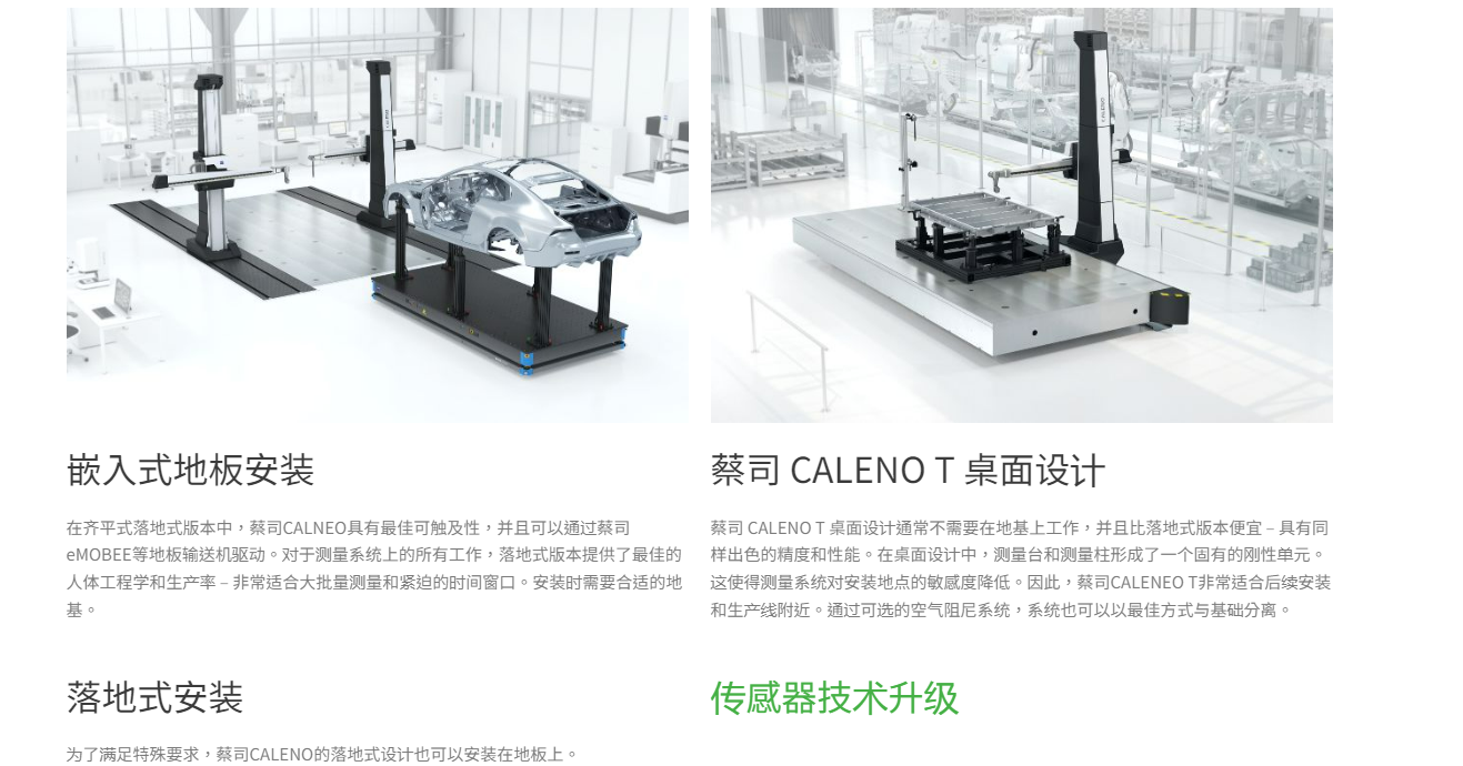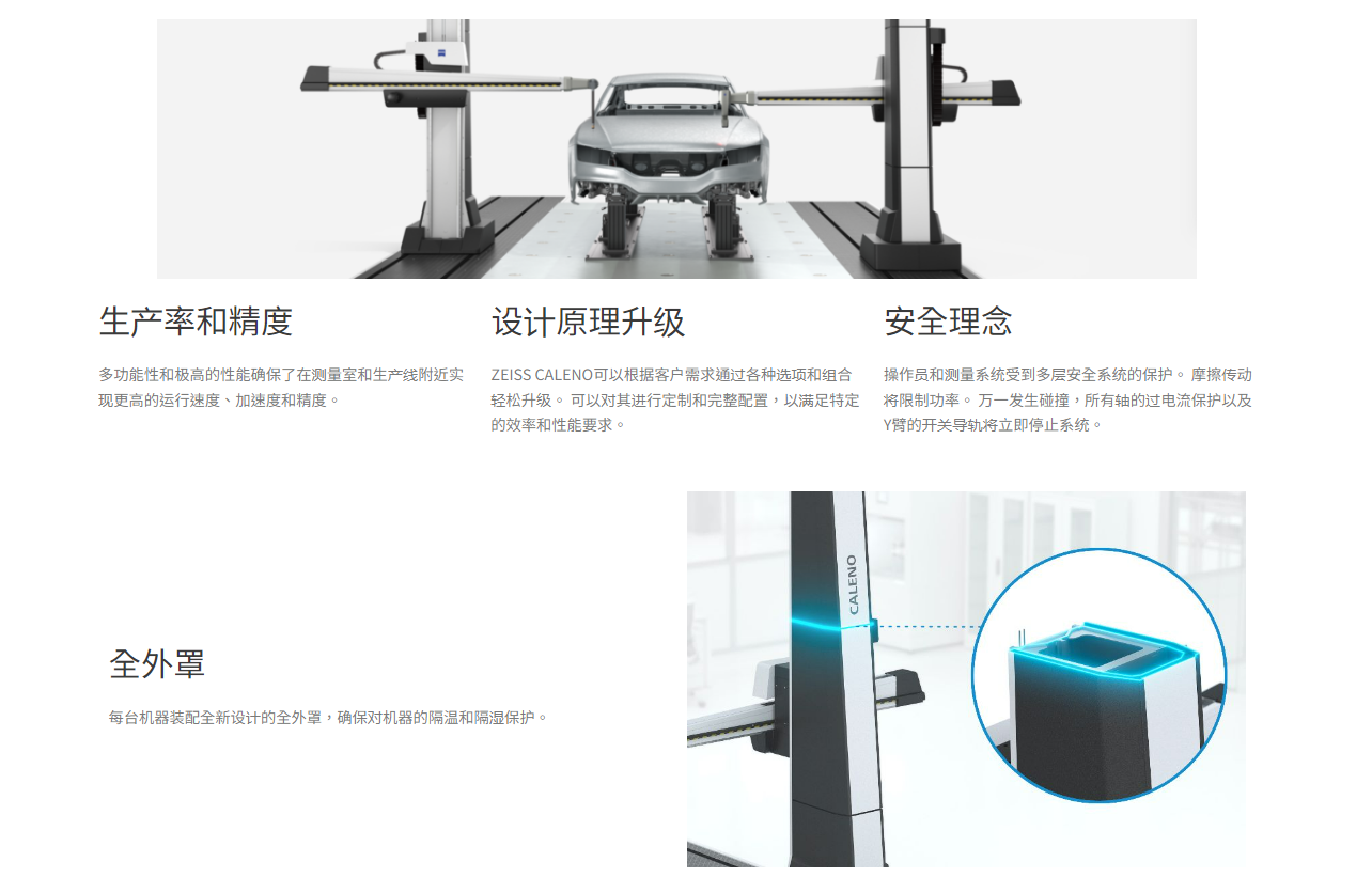 ZEISS CALENO结合了坐标测量机的精度、协作系统以及带有自动模具更换装置的出色多测头系统。多功能性和极高的性能确保了在测量室和生产线附近实现更高的运行速度、加速度和精度。